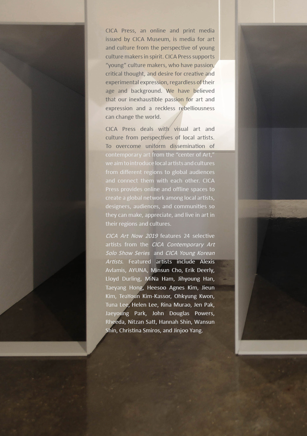CICA Press, an online and print media issued by CICA Museum, is media for art and culture from the perspective of young culture makers in spirit. CICA Press supports “young” culture makers, who have passion, critical thought, and desire for creative and experimental expression, regardless of their age and background. We have believed that our inexhaustible passion for art and expression and a reckless rebelliousness can change the world.