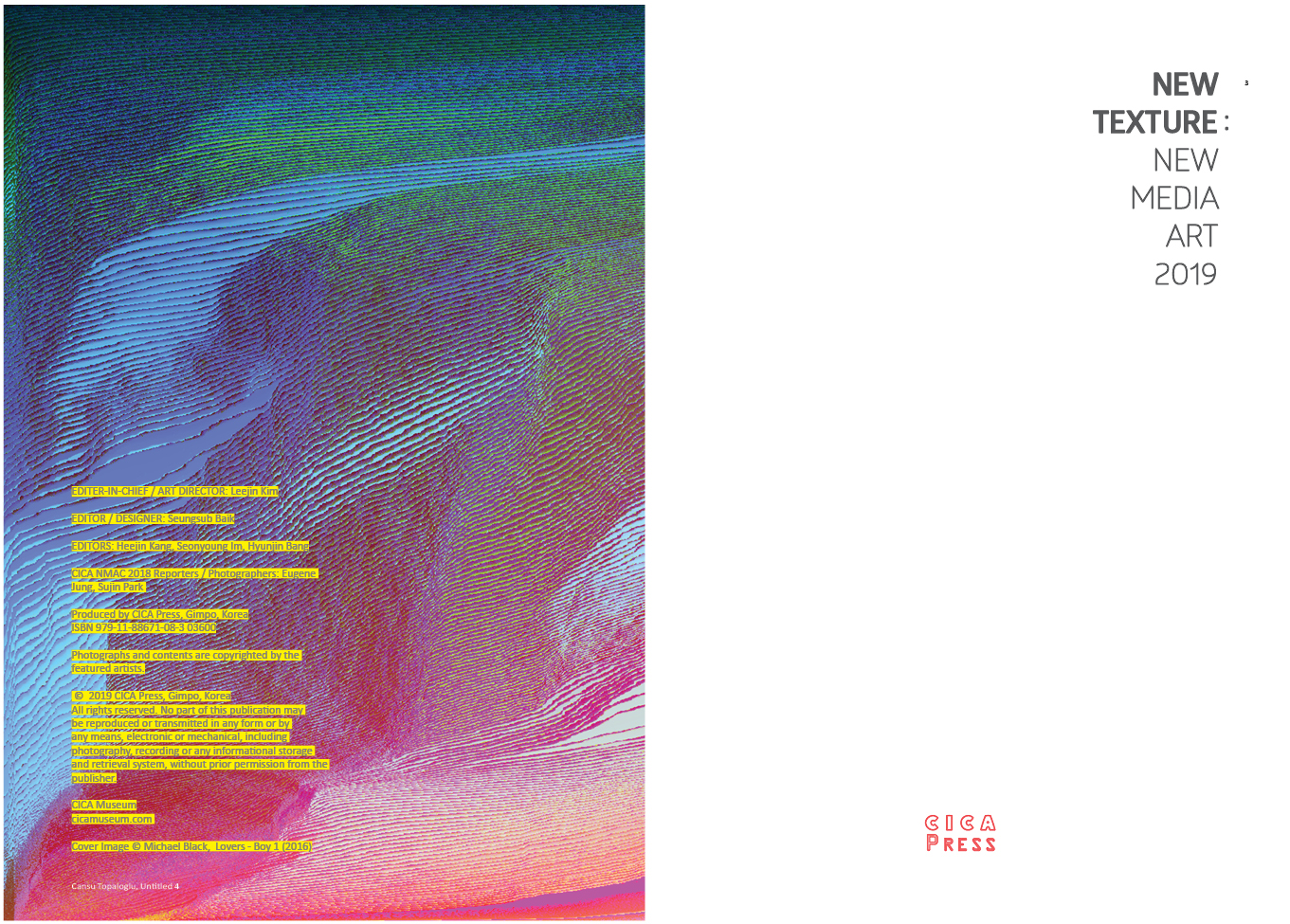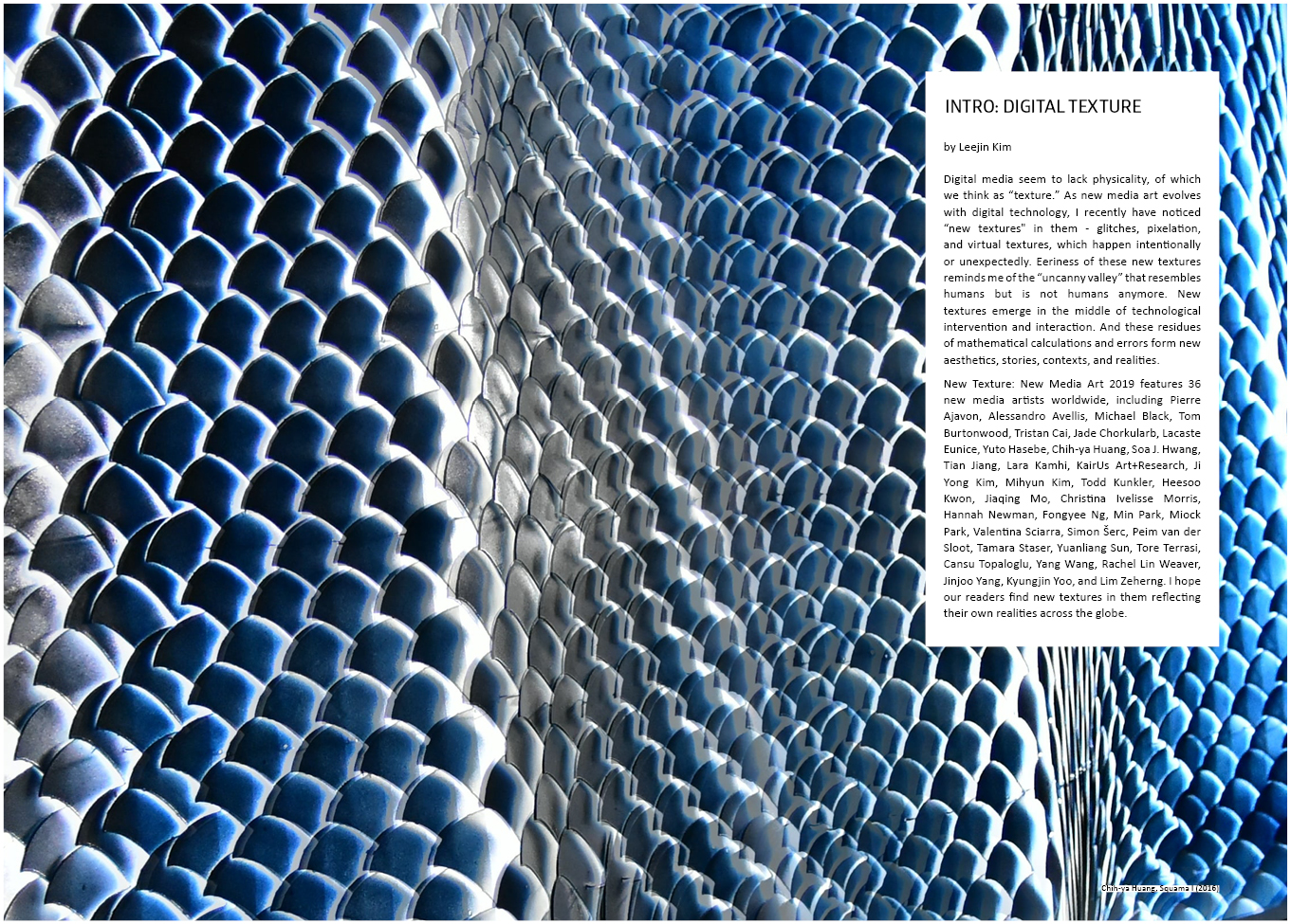 New Texture: New Media Art 2019 features 36 new media artists worldwide, including Pierre Ajavon, Alessandro Avellis, Michael Black, Tom Burtonwood, Tristan Cai, Jade Chorkularb, Lacaste Eunice, Yuto Hasebe, Chih-ya Huang, Soa J. Hwang, Tian Jiang, Lara Kamhi, KairUs Art+Research, Ji Yong Kim, Mihyun Kim, Todd Kunkler, Heesoo Kwon, Jiaqing Mo, Christina Ivelisse Morris, Hannah Newman, Fongyee Ng, Min Park, Miock Park, Valentina Sciarra, Simon Šerc, Peim van der Sloot, Tamara Staser, Yuanliang Sun, Tore Terrasi, Cansu Topaloglu, Yang Wang, Rachel Lin Weaver, Jinjoo Yang, Kyungjin Yoo, and Lim Zeherng. I hope our readers find new textures in them reflecting their own realities across the globe.